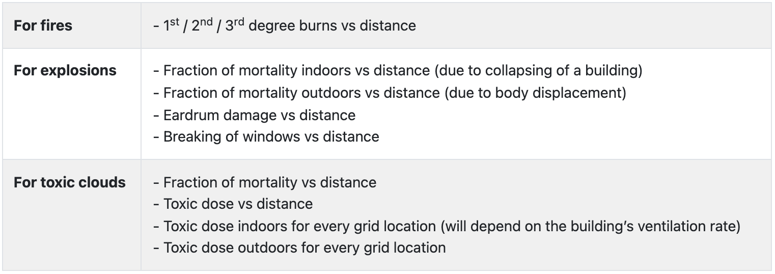 The third step of a QRA is to assess the physical effects of the described loss of containment scenarios. Typical physical effects that need to be assessed are heat radiation (for fires), overpressure (for explosions), and toxic concentrations (for toxic clouds). Some examples are: